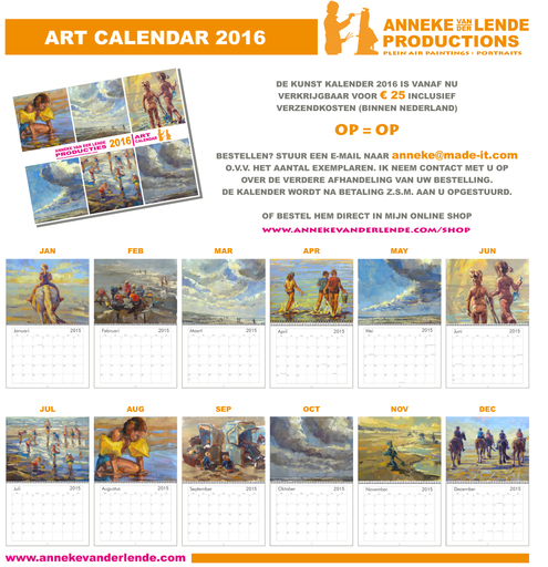 De KUNST KALENDER 2016 van Anneke van der Lende Producties is weer verkrijgbaar in mijn shop. Wil jij ook zo'n fijne wandkalender met daarin een overzicht van 12 werken die ik afgelopen jaar schilderde? Bestel hem snel. Want.........